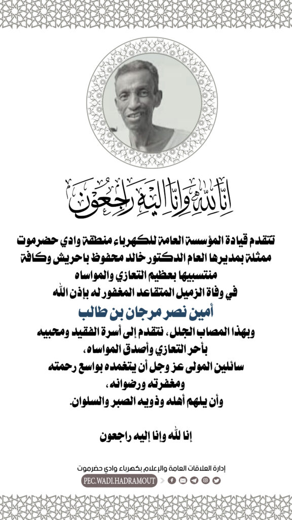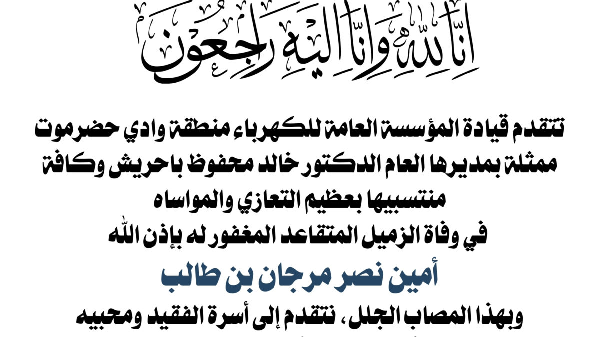 تتقدم قيادة المؤسسة العامة للكهرباء منطقة وادي حضرموت ممثلة بمديرها العام الدكتور خالد محفوظ باحريش وكافة منتسبيها بعظيم التعازي والمواساه