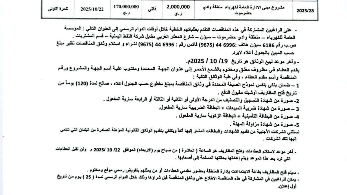 📢مناقصة مشروع مبنى الإدارة العامة للكهرباء منطقة وادي حضرموت