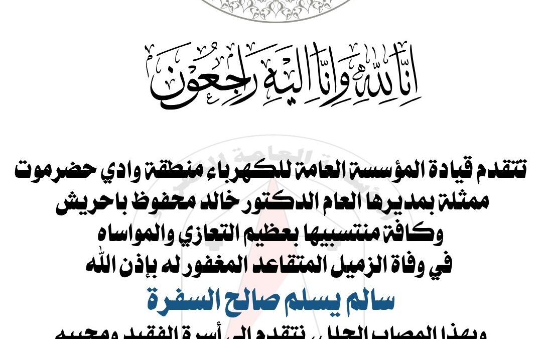 07/10/2025تتقدم قيادة المؤسسة العامة للكهرباء منطقة وادي حضرموت ممثلة بمديرها العام الدكتور خالد محفوظ باحريش