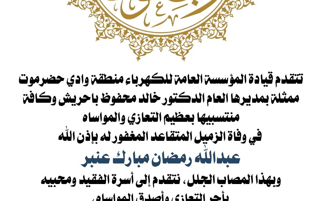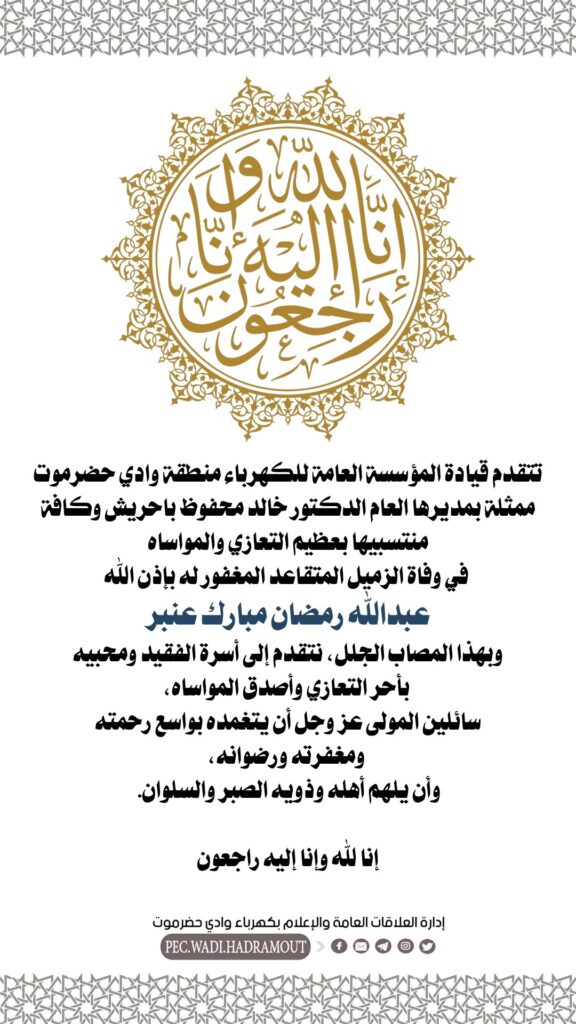 19/09/2025تتقدم قيادة المؤسسة العامة للكهرباء منطقة وادي حضرموت ممثلة بمديرها العام الدكتور خالد محفوظ باحريش وكافة منتسبيها بعظيم التعازي والمواساه