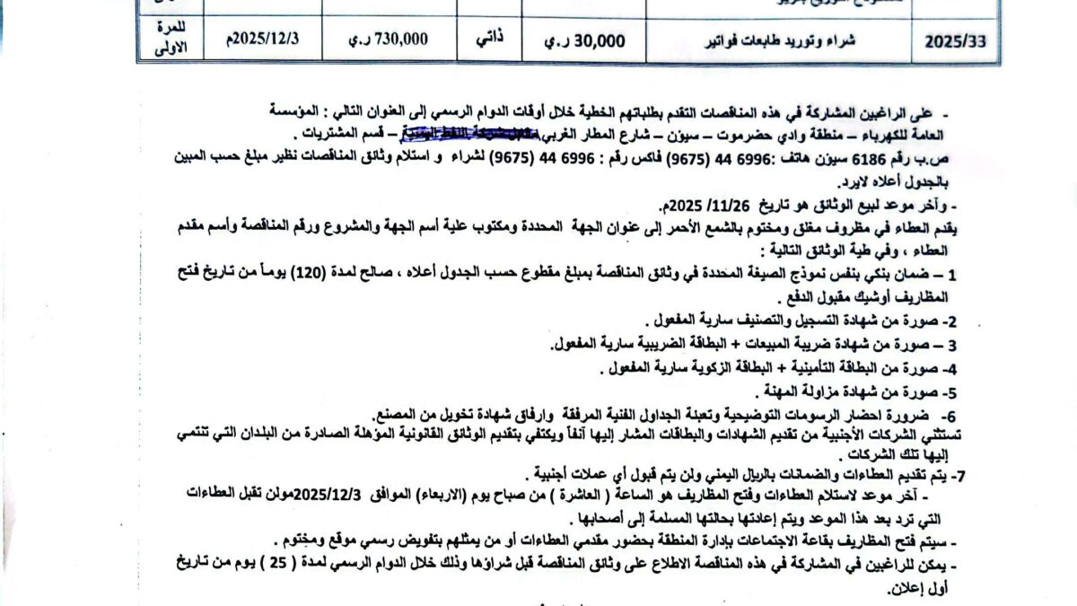 📢تعلن المؤسسة العامة للكهرباء منطقة وادي حضرموت عن إنزال المناقصات التاليه: