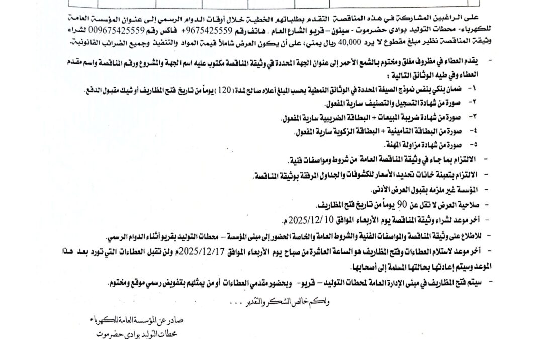*تعلن المؤسسة العامة للكهرباء- الإدارة العامه لمحطات التوليد بوادي حضرموت عن إنزال المناقصة التالية:*
