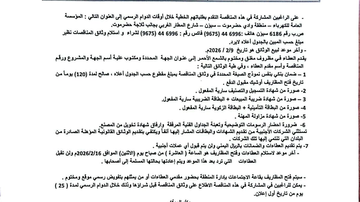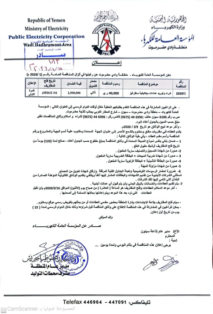 📢 مناقصة عدادات ميكانيكية سنقل فيز كهرباء وادي حضرموت