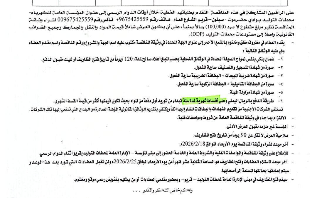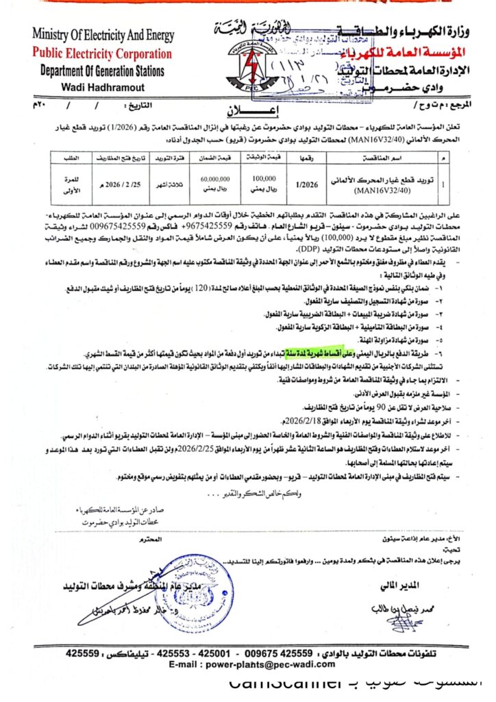 *تعلن المؤسسة العامة للكهرباء- الإدارة العامه لمحطات التوليد بوادي حضرموت عن إنزال المناقصة التالية:*
