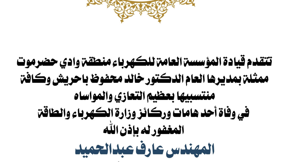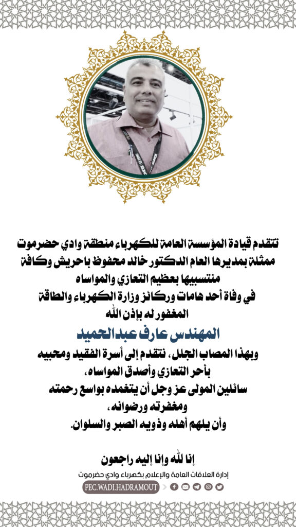 تتقدم قيادة المؤسسة العامة للكهرباء منطقة وادي حضرموت ممثلة بمديرها العام الدكتور خالد محفوظ باحريش وكافة منتسبيها بعظيم التعازي والمواساه