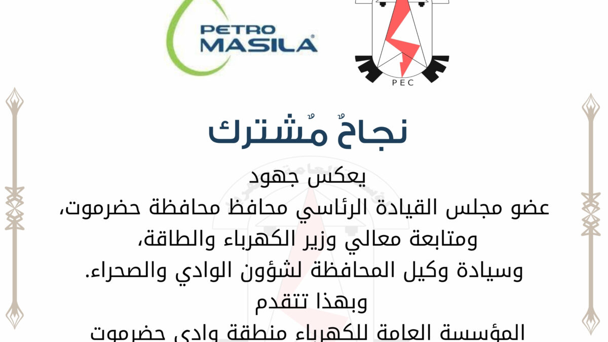 يعكس جهود عضو مجلس القيادة الرئاسي محافظ محافظة حضرموت، ومتابعة معالي وزير الكهرباء والطاقة،