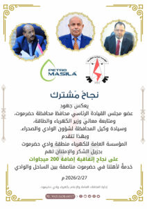وبهذا تتقدم المؤسسة العامة للكهرباء منطقة وادي حضرموت،بجزيل الشكر والإمتنان لهم
