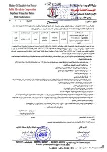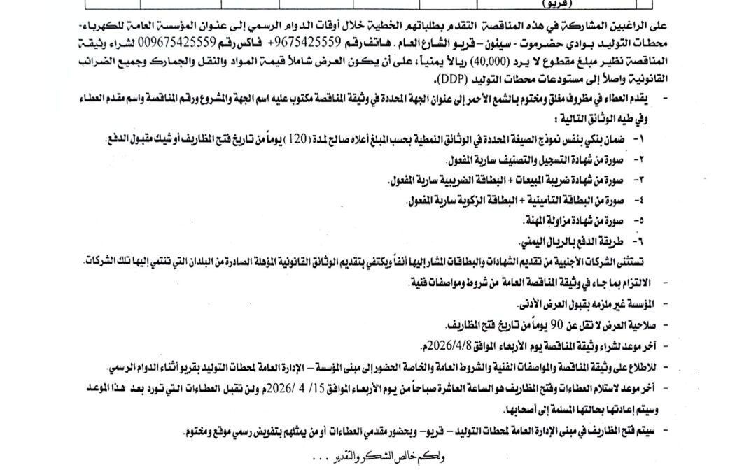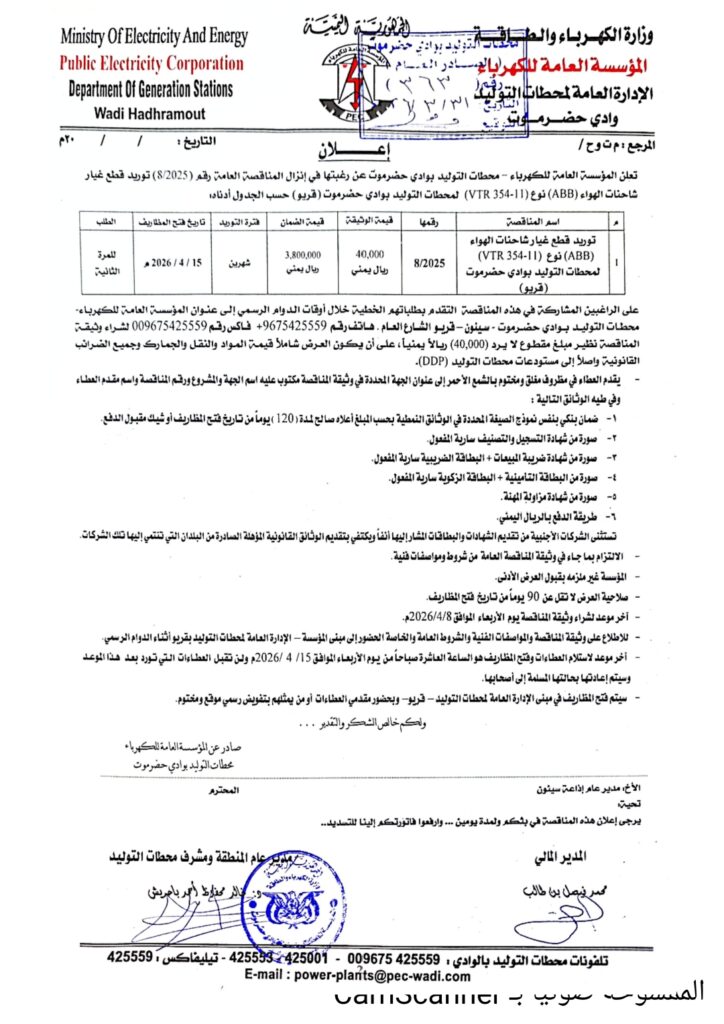 *تعلن المؤسسة العامة للكهرباء- الإدارة العامه لمحطات التوليد بوادي حضرموت عن إنزال المناقصة التالية:*