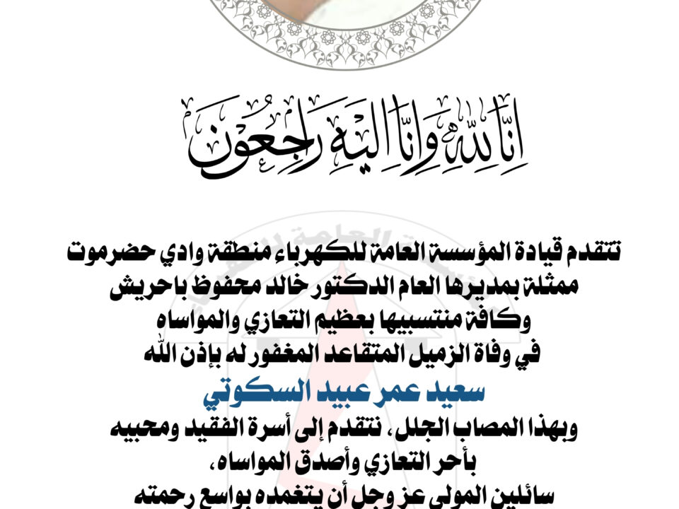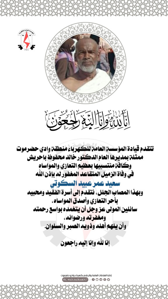 ⚫ *تعزية* تتقدم قيادة المؤسسة العامة للكهرباء منطقة وادي حضرموت ممثلة بمديرها العام الدكتور خالد محفوظ باحريش وكافة منتسبيها بعظيم التعازي والمواساه في وفاة الزميل المتقاعد […]