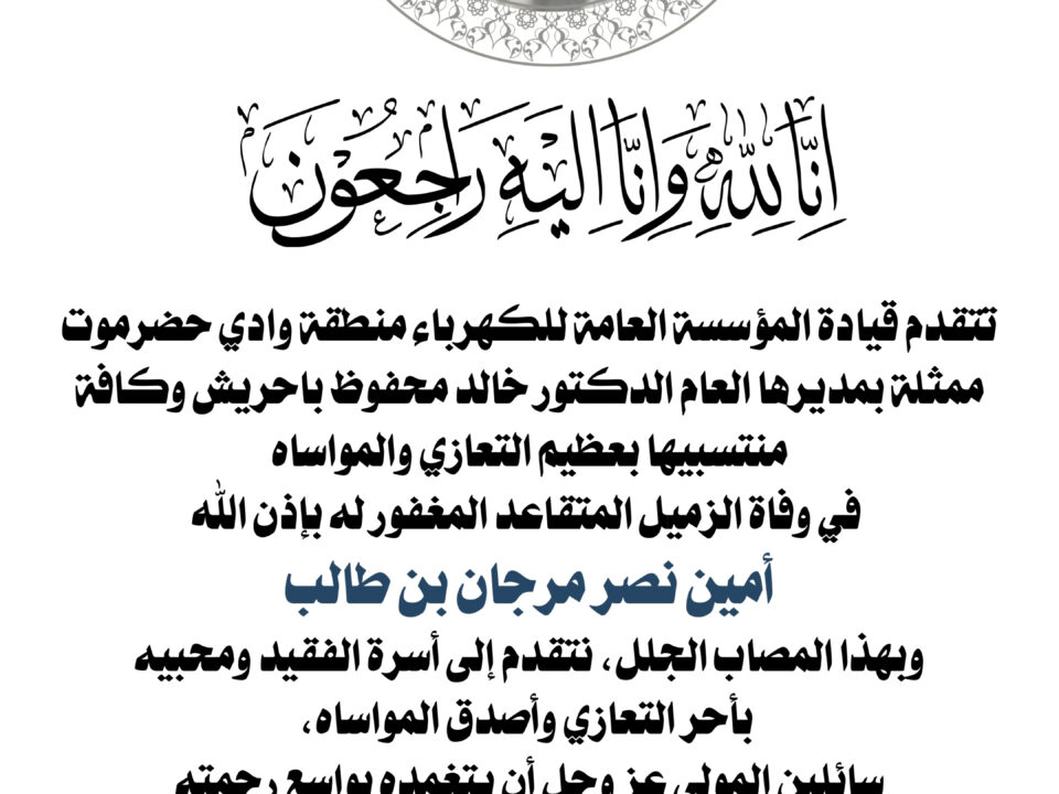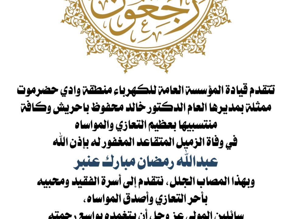 تعزية تتقدم قيادة المؤسسة العامة للكهرباء منطقة وادي حضرموت ممثلة بمديرها العام الدكتور خالد محفوظ باحريش وكافة منتسبيها بعظيم التعازي والمواساه في وفاة الزميل المغفور له […]