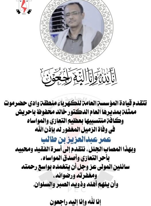 ⚫تعزية تتقدم قيادة المؤسسة العامة للكهرباء منطقة وادي حضرموت ممثلة بمديرها العام الدكتور خالد محفوظ باحريش وكافة منتسبيها بعظيم التعازي والمواساه في وفاة الزميل المتقاعد المغفور […]
