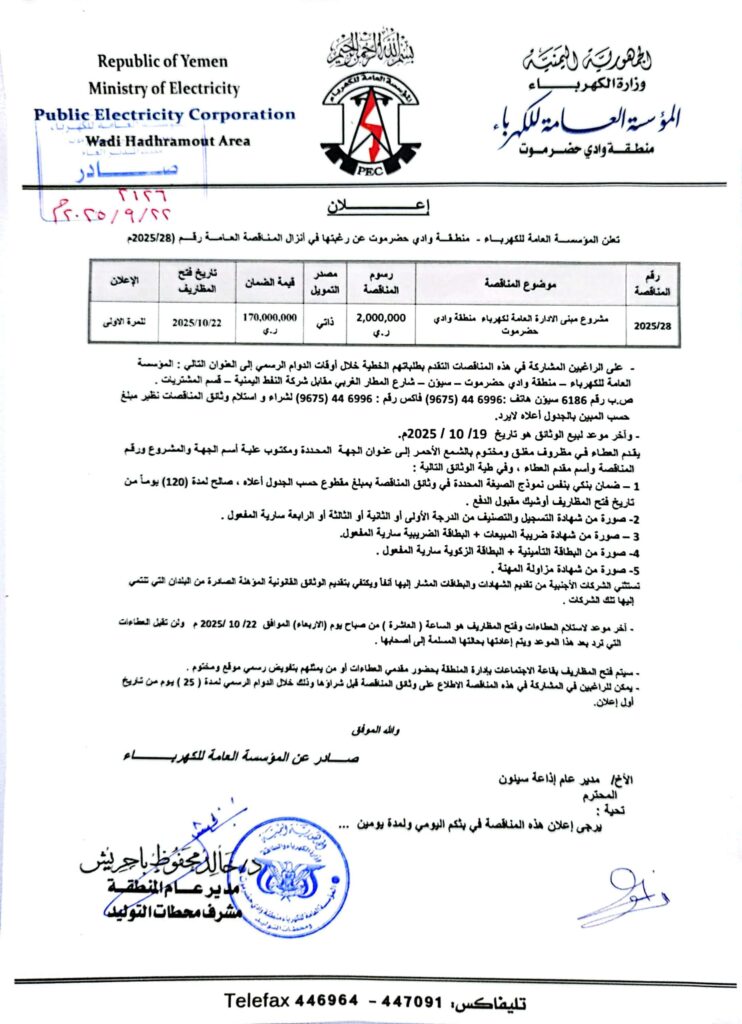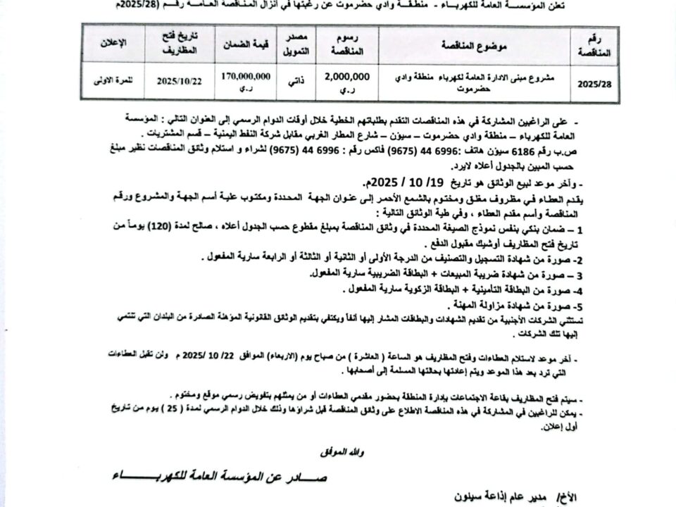 📢⏳ إعلان مناقصة⏳ 📢تعلن المؤسسة العامة للكهرباء منطقة وادي حضرموت عن إنزال المناقصة التاليه: ⬇️ ⬇️ ⬇️ ⬇️ ◀️28/2025 ( مشروع مبنى الإدارة العامة للكهرباء- منطقة […]