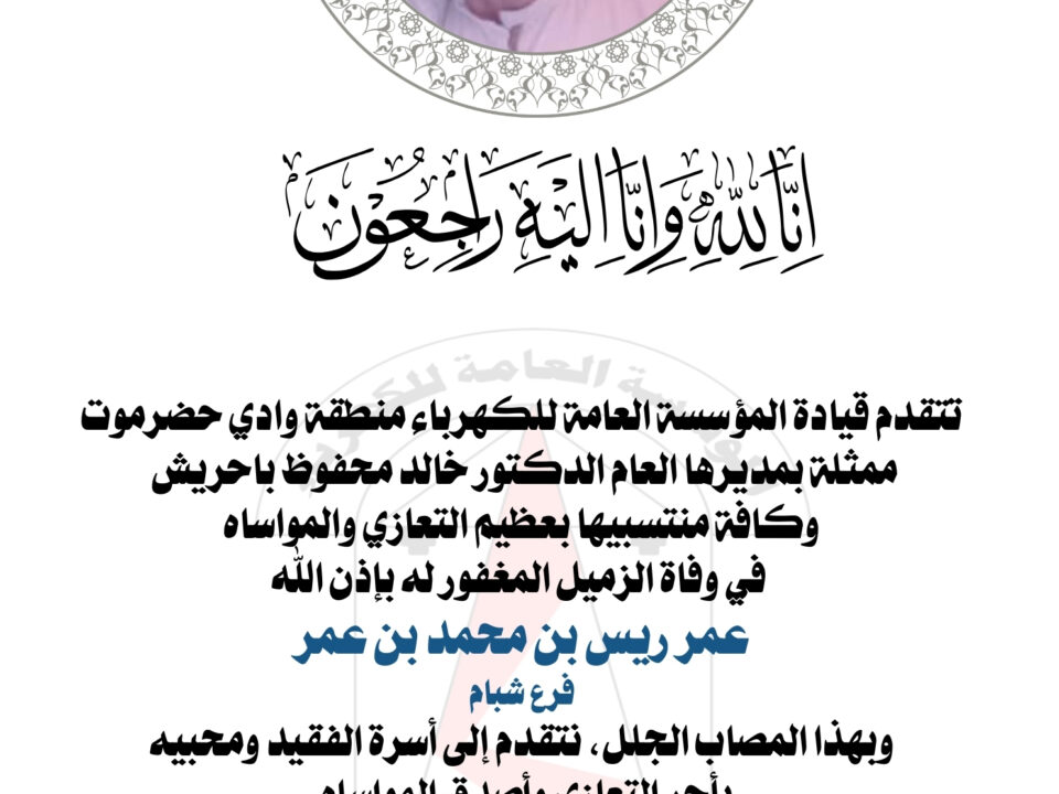 ⚫تعزية⚫ تتقدم قيادة المؤسسة العامة للكهرباء منطقة وادي حضرموت ممثلة بمديرها العام الدكتور خالد محفوظ باحريش وكافة منتسبيها بعظيم التعازي والمواساه في وفاة الزميل المغفور له […]