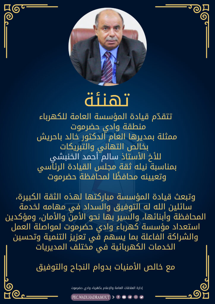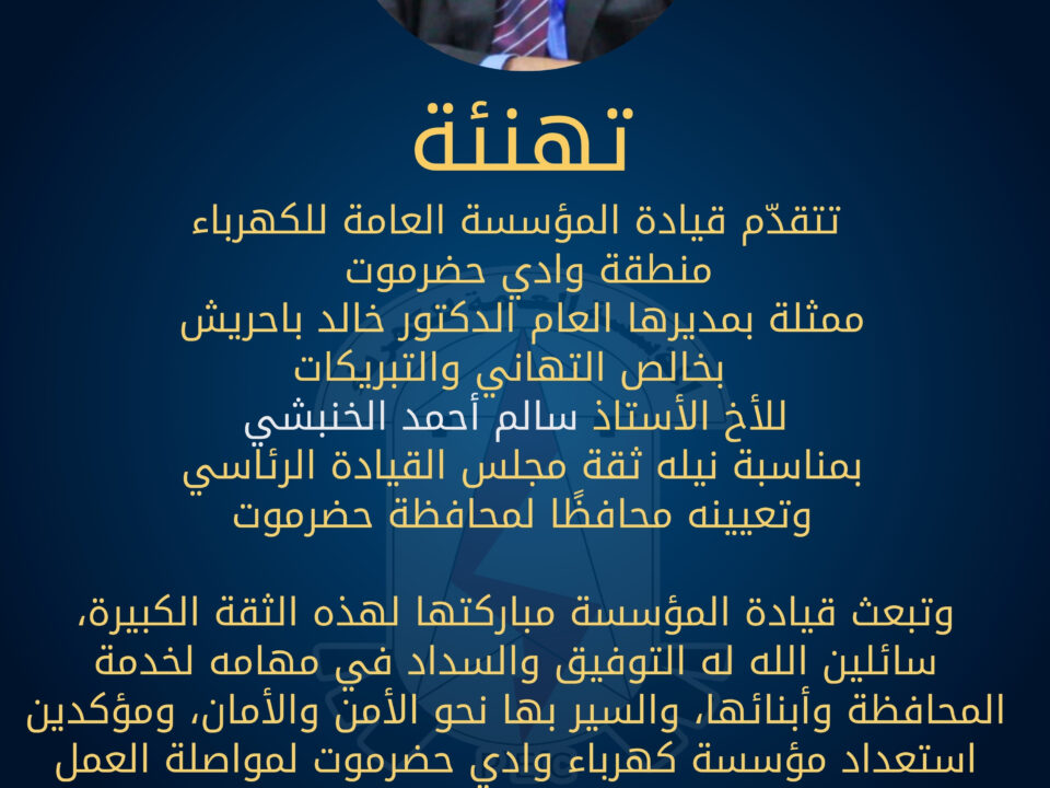 *تهنئة* تتقدّم قيادة المؤسسة العامة للكهرباءمنطقة وادي حضرموت ممثلة بمديرها العام الدكتور خالد باحريش بخالص التهاني والتبريكات للأخ الأستاذ سالم أحمد الخنبشي بمناسبة نيله ثقة مجلس […]